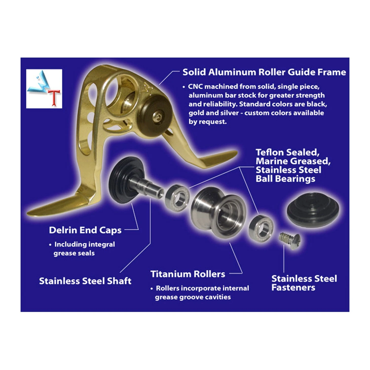 - Anodized finish available in Black, Gold, or Silver Every roller guide incorporates stainless streel rollers riding on two stainless steel, Teflon sealed ball bearings that ensure smooth line flow, consistent drag pressure, and superior corrosion resistance